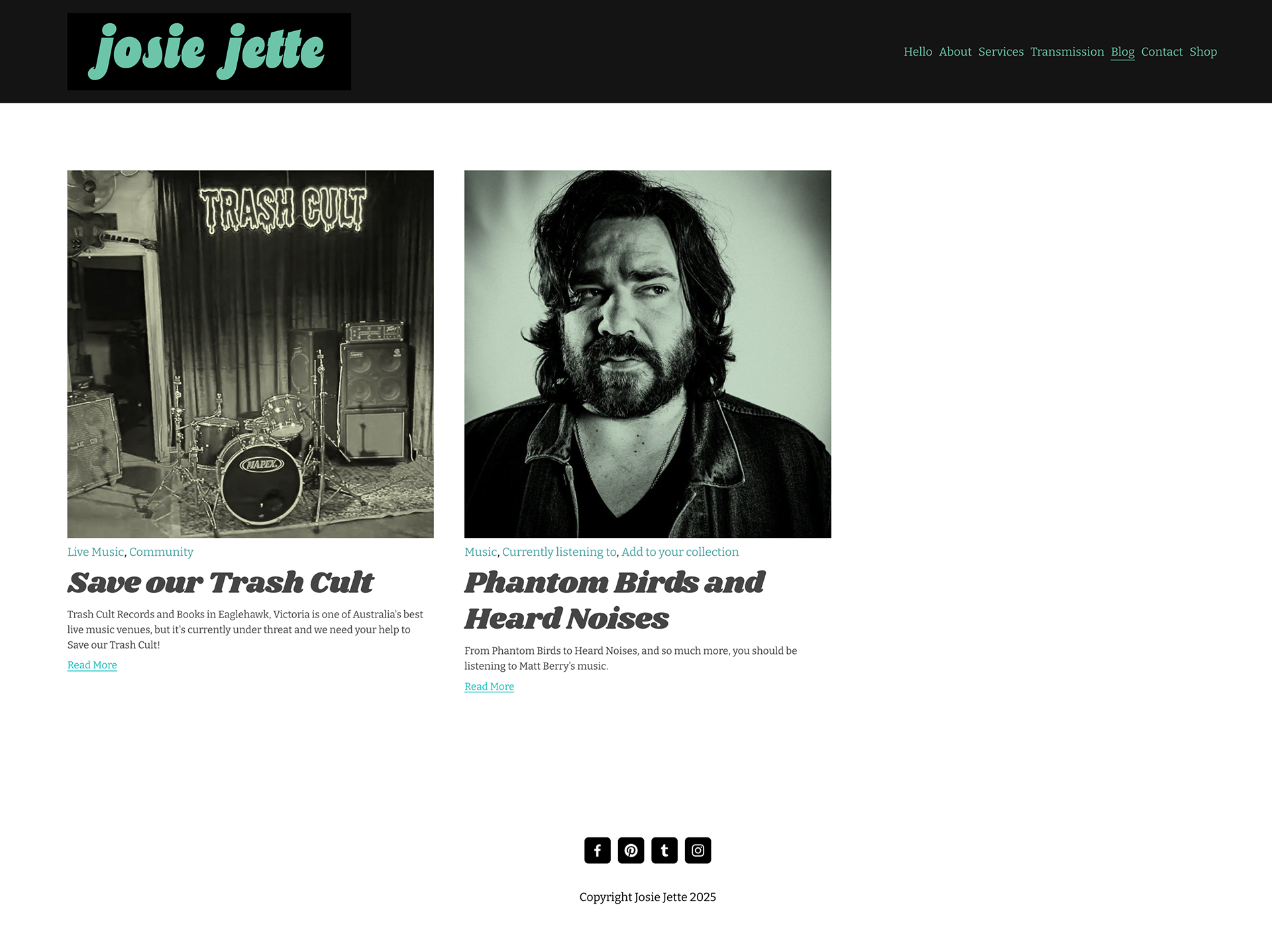 Josie Jette is a Singer/ Songwriter who fuses lyrics with melody to create catchy tunes that will dive in, get lost in the maze of your mind and stay there for days, searing your synapses and becoming part of your brain waves. My role was to create the new branding to reflect her musical direction and then translate that into an engaging website to showcase her music, writing and design work.